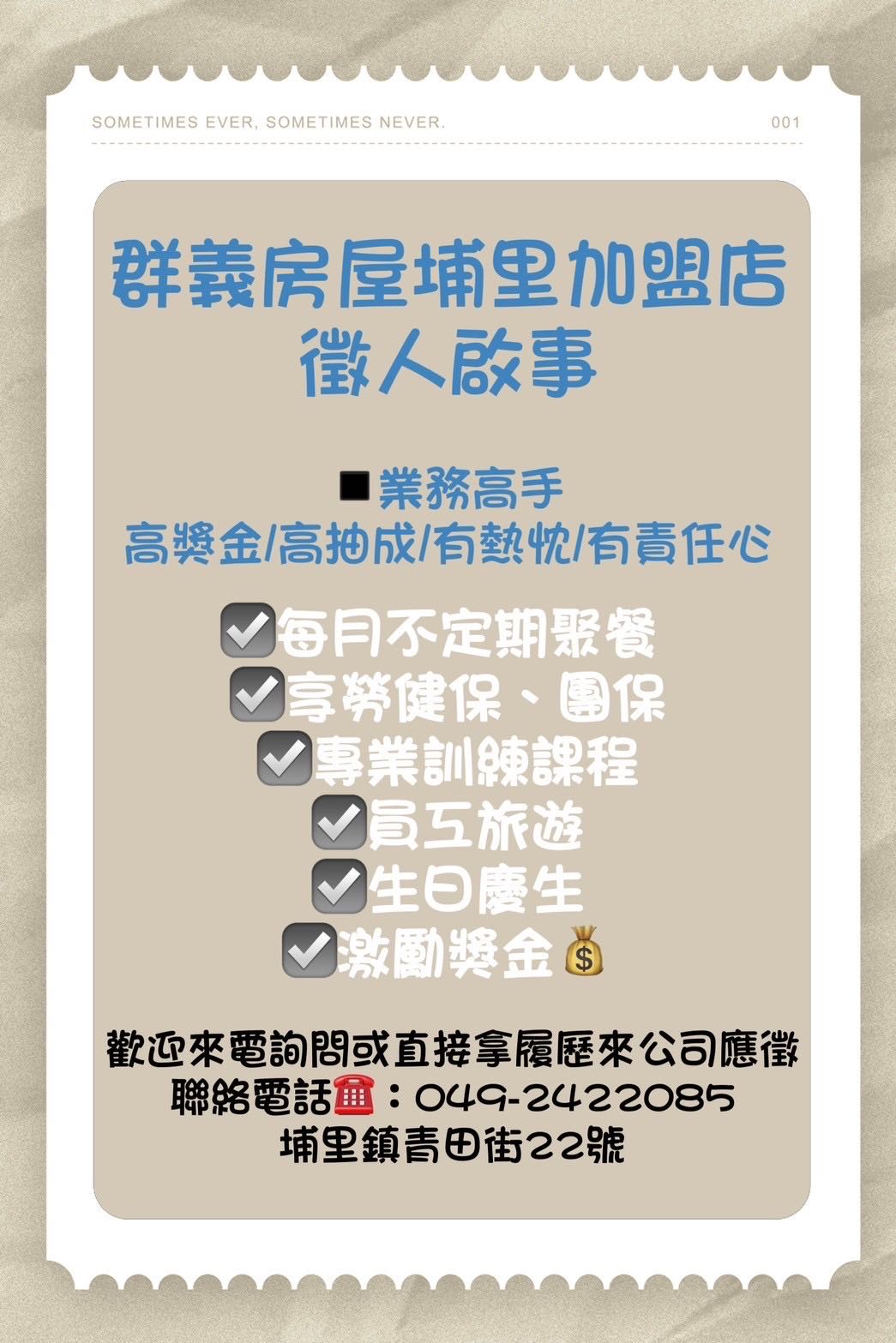 【品牌介紹】群義房屋埔里加盟店是由一群積極熱忱,且懷抱著對房地產有熱血的超級業務們所組成。 【產品服務】能為每一位客戶找尋到合適的物件是我們的使命,主要經營產品為透天住宅、店面、公寓大樓、預售新成屋、農建地等買賣。 我們秉持專業用心的態度,竭誠的為您服務,買屋賣屋請指名專業、實在的群義房屋埔里加盟店。