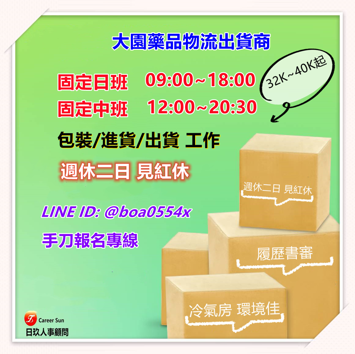 ☞派駐廠商:富邦momo ☞工作地點:桃園市蘆竹區南青路1255號 >>>長期穩定<<< ✌️無經驗可✌️等當兵可✌️長短期可 ✌️書審履歷✌️高錄取率✌️即刻上班 ✌️特休假別✌️兩節禮盒✌️不收福利金 ✌️勞、健,勞退6%,僱主責任險 ✌️六、日上班一天最高320元(兼職無) ✌️急需用錢週領最高7000元(兼職除2) >>>工作介紹<<< ■工作內容 包裹刷條碼、理貨、檢貨、包貨、分貨、出貨.. 包裹最重只有10~20公斤,任何人都能輕鬆負荷 ■班別-自選 午 B:15:00~24:00 時薪236元;月均42K 晚班:18:00~03:00 時薪246元;月均44K *加班費另計 ■休假:排休制(8~9天/月,自己可以選4天) >>>【應徵方式】<<< ✌️截圖後-快速應徵:https://lin.ee/AeE2u7i ✌️沃克人力:02-2388-1982 ✌️葉專員:0967255368