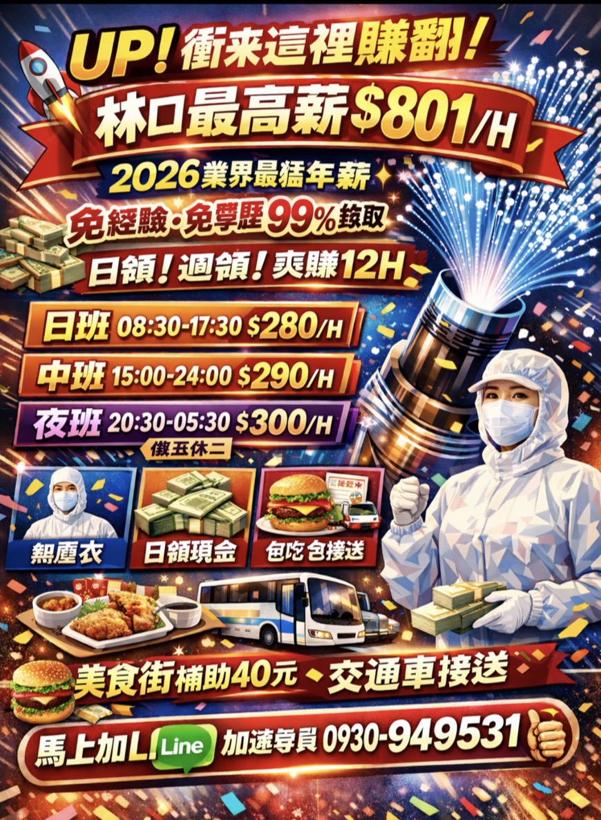 - UP 現在大家都來這間 林口早中夜最高薪801$/H